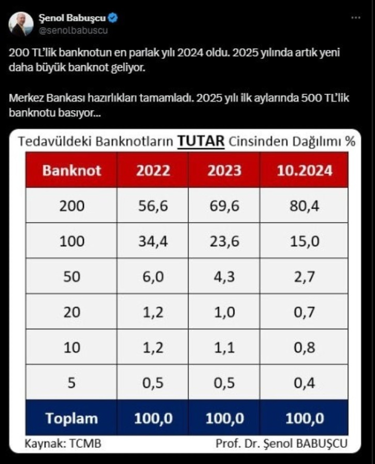 "200 TL'lik banknotun en parlak yılı 2024 oldu. 2025 yılında artık yeni daha büyük banknot geliyor. Merkez Bankası hazırlıkları tamamladı. 2025 yılı ilk aylarında 500 TL'lik banknotu basıyor..."