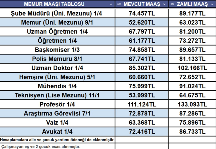 6 AYLIK ENFLASYON FARKI VE TOPLU SÖZLEŞMEYE GÖRE MEMUR MAAŞ TABLOSU