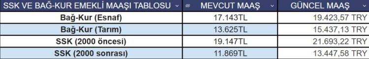 SSK VE BAĞ-KUR EMEKLİSİ MAAŞ TABLOSU