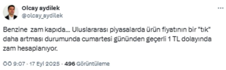 Aydilek, X hesabı üzerinden yaptığı paylaşımda benzine 1 lira zam beklenildiğini aktardı. Motorin ve otogaz için ise herhangi bir zam haberi vermedi. Aydilek'in X paylaşımı şu şekilde: