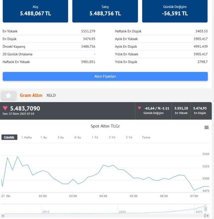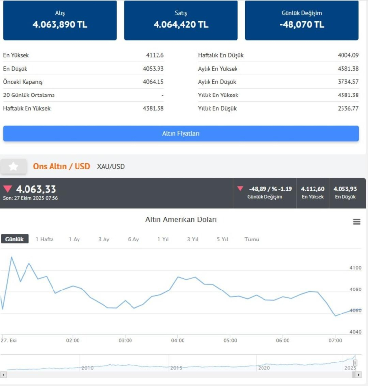 Peş peşe rekorların ardından düşüşe geçen altın fiyatlarında son durum merak ediliyor. 27 Ekim 2025 gram altın fiyatı 5.483 TL, ve ons fiyatı 4.063 dolar seviyelerinde seyrediyor. Analistler, ABD-Çin geriliminin azalacağına dair haber akışının güvenli liman talebini zayıflatan başlıca etkenler arasında yer aldığını belirtiyor. Geçtiğimiz hafta ons altın fiyatı yüzde 3,2 değer kaybederken yeni haftaya da düşüşle başladı.