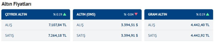 Şu sıralar gram altın 4 bin 442 liradan seyrediyor, Kapalı Çarşıda ise 4 bin 423 liradan işlem görüyor. Çeyrek altın 7 bin 107 TL iken Kapalı Çarşıda ise 7 bin 077 liradan işlem görüyor.