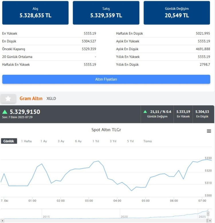 Gram altın fiyatları saat 07.29 itibarıyla 5329 TL seviyesinde.