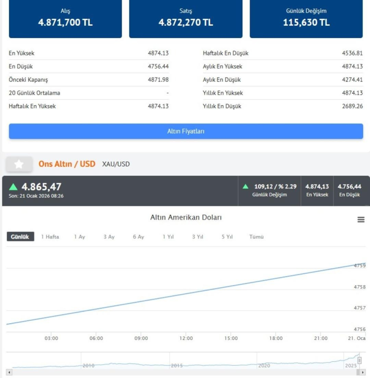 Altın fiyatları rekor serisine devam ediyor. Piyasalar yeni günde de rekorla karşılaştı. Gram altın ve ons altında yeni rekor seviyeler görüldü. Jeopolitik risk tarafından Trump'ın Grönland ile ilgili tavrı ve küresel ekonomiye dair belirsizlikler etkili oldu. Güvenli liman talebi, ons fiyatını 4 bin 800 doların üzerine taşıdı.