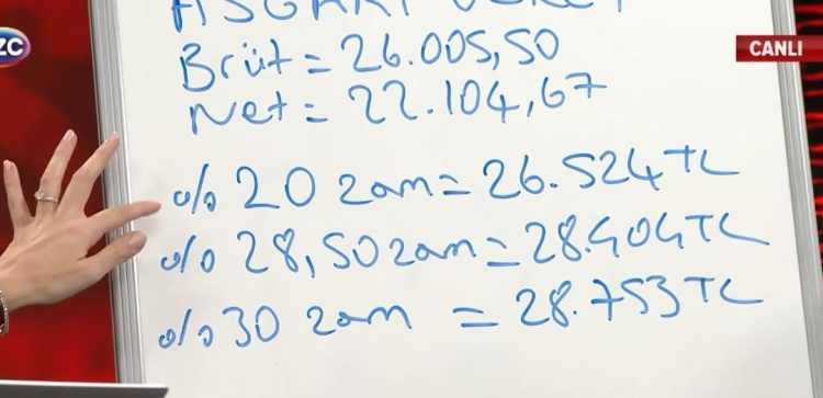 Sözcü TV'de konuşan Sosyal Güvenlik Uzmanı Mehmet Akif Cenkci "Asgari ücret nedir? Asgari ücret bir kişinin bir ay boyunca temel ihtiyaçlarını en azami tutarda seviyede karşılayabileceği ve bunun karşılığında aldığı ücret. Bunda kira, yakacak, giyinme, barınma, sağlık, eğitim var. Bu rakam brüt 26 bin 2025 yılı için, net ise 22 bin 104 TL 67 kuruştur. Asgari ücrete eğer yüzde 20 zam yapılırsa asgari ücretimiz 26 bin 524 TL olur. Eğer ki yüzde 28.50 zam gelirse 28 bin 404 TL olur. Yüzde 30 zam gelir ise 28 bin 753 TL olur" dedi.