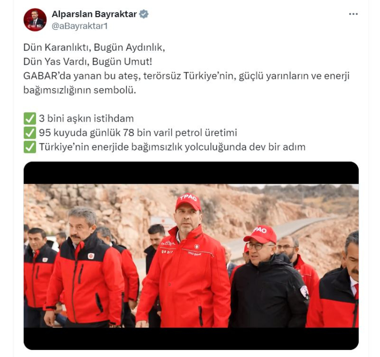 Bakan Bayraktar, sosyal medya hesabında, Gabar'daki petrol üretiminden görüntü paylaşarak, "Dün karanlıktı, bugün aydınlık, dün yas vardı, bugün umut. Gabar'da yanan bu ateş, terörsüz Türkiye'nin, güçlü yarınların ve enerji bağımsızlığının sembolü. 3 bini aşkın istihdam, 95 kuyuda günlük 78 bin varil petrol üretimi, Türkiye’nin enerjide bağımsızlık yolculuğunda dev bir adım" dedi.