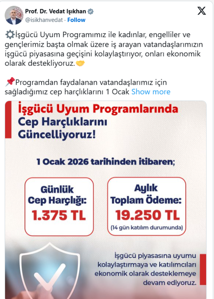 Çalışma ve Sosyal Güvenlik Bakanı Vedat Işıkhan sosyal medya hesabından İşgücü Uyum Programlarında cep harçlığı ücretlerinin artırıldığını duyurdu.