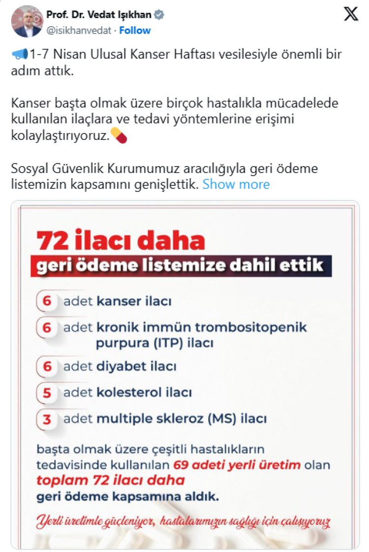 Çalışma ve Sosyal Güvenlik Bakanı Vedat Işıkhan, 1-7 Nisan Ulusal Kanser Haftası kapsamında önemli bir düzenlemenin hayata geçirildiğini duyurdu. Sosyal medya hesabından açıklama yapan Bakan Işıkhan, kanser başta olmak üzere birçok hastalığın tedavisinde kullanılan ilaçlara ve tedavi yöntemlerine erişimi kolaylaştırmak amacıyla geri ödeme listesinde genişlemeye gidildiğini belirtti.
