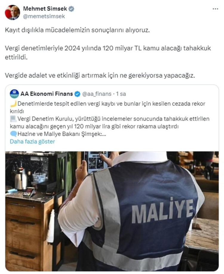 "Kayıt dışılıkla mücadelemizin sonuçlarını alıyoruz. Vergi denetimleriyle 2024 yılında 120 milyar TL kamu alacağı tahakkuk ettirildi. Vergide adalet ve etkinliği artırmak için ne gerekiyorsa yapacağız"