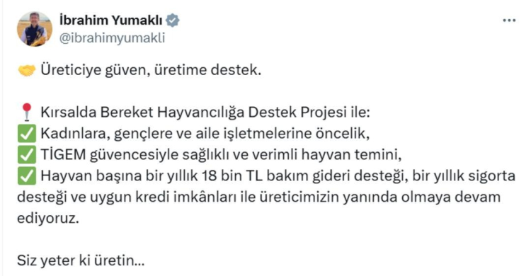 Tarım ve Orman Bakanı İbrahim Yumaklı, Kırsalda Bereket Hayvancılığa Destek Projesi'ne ilişkin, "Bu projede her bir hayvan için hak sahibi olan üreticilerimiz hayvan başına 18 bin lira yıllık bakım ve diğer masrafları için bizden destek alacak. Şöyle düşünelim, 15 hayvanı almış olan bir üretici bir asgari ücreti her ay almış olacak" dedi.