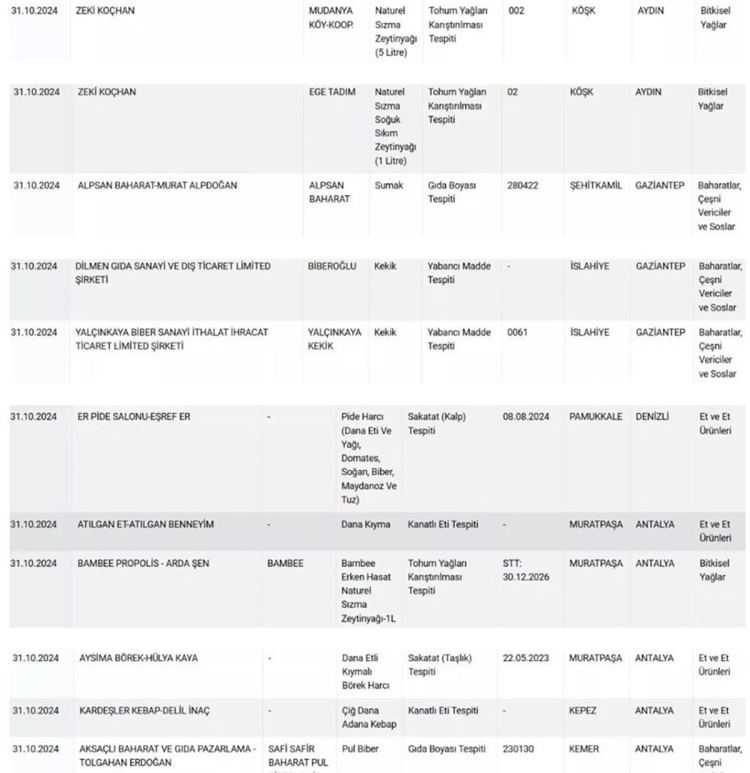 Yeni listede ise pul biber ve sumakta gıda boyası, kebap ve kıymada kanatlı et, zeytinyağında tohum yağları, pide harcında sakatat (kalp), kekikte yabancı madde, peynirde bitkisel yağ, tereyağında sahtecilik tespit edildi.