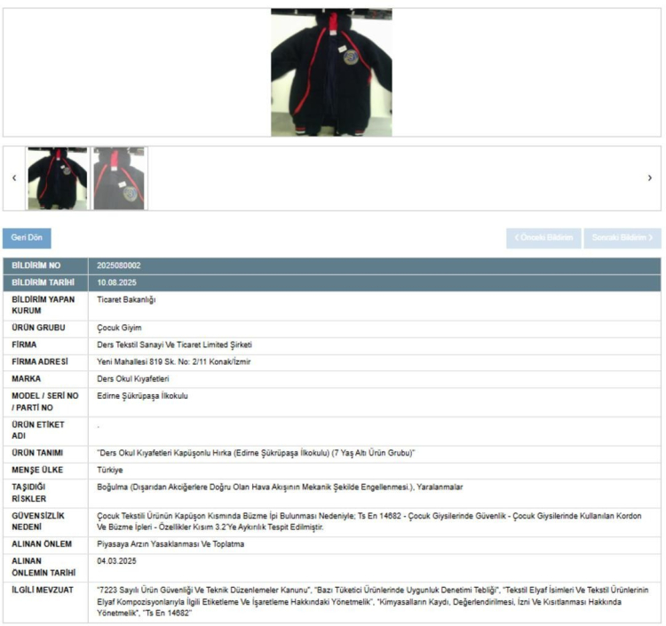Edirne Şükrüpaşa İlkokulu ünifroması olan üründe boğulma ve yaralanma riski tespit edildi. Güvensizlik nedeni ise şu şekilde açıklandı: