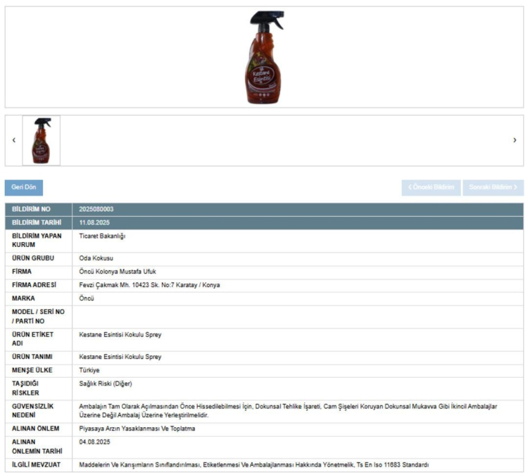 Öncü markalı "Kestane Esintisi Kokulu Sprey" de sağlık riski tespit edildi. Ürün için 4 Ağustos tarihinde önlem alındığı ifade edildi.