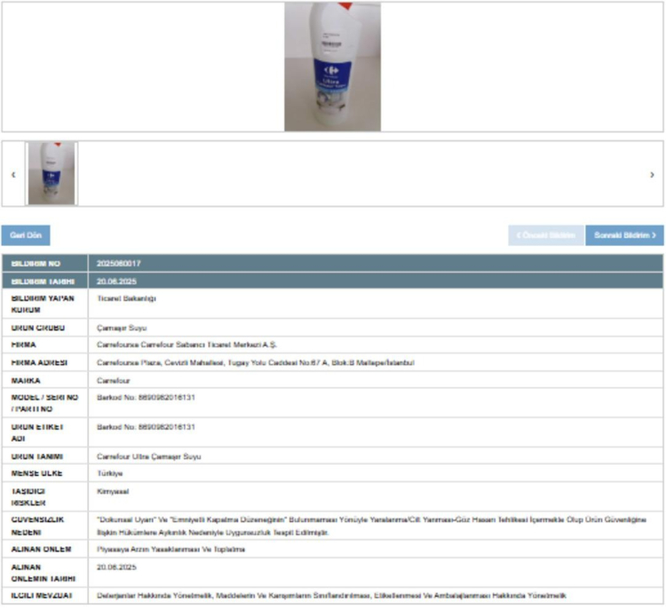 Ticaret Bakanlığı, Güvensiz Ürün Bilgi Sistemi (GÜBİS) üzerinden yaptığı son duyuruda, çocuk sağlığını ve tüketici güvenliğini tehlikeye atan ürünleri tek tek kamuoyuna açıklamaya devam ediyor. Bu kez listede, Bursa'da da şubeleri bulunan Carrefour Sabancı Ticaret Merkezi A.Ş.'ye ait çamaşır suyu yer aldı. Bakanlık tarafından yapılan açıklamada, söz konusu çamaşır suyunun üzerinde emniyet kapağının bulunmaması nedeniyle çocuklar için ciddi zehirlenme riski taşıdığı ifade edildi. Avrupa Birliği güvenlik standartlarını da karşılamayan ürün için toplatma kararı verildi.