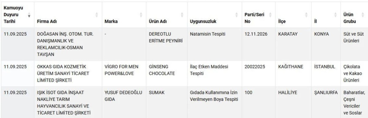 Ekonomim'in haberine göre bakanlık, sağlıklı ve güvenli gıdaya erişimi sağlamak için denetimlerini sıklaştırırken, uygunsuz olduğu belirlenen ürün ve markaları kamuoyuyla paylaşıyor.