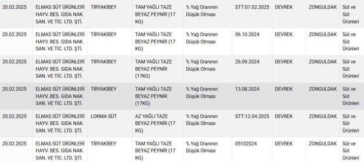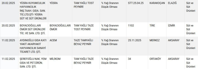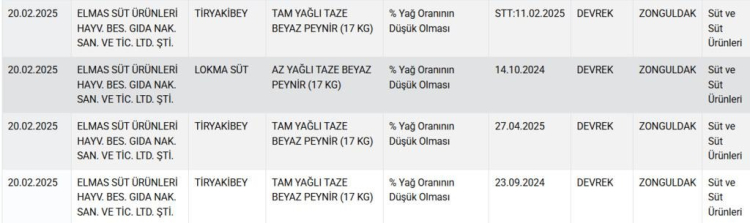 Zonguldak'ta üretim yapan Tiryakibey peynir markası 8 ürünü ile beraber listeye girdi. Markanın ürünlerinde Bakanlık yüzde yağ oranının düşük olduğunu tespit etti.