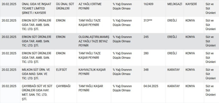 Dün yayımlanan listeye giren markaların tamamında yağ oranlarının düşük olduğu tespit edilirken peynirlerin üretildiği şehirler ise Konya, Kayseri, Elazığ, İzmir, Aksaray oldu.