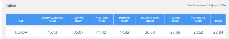 Peki, 15 Ağustos 2024 itibarıyla Bursa'da benzin, otogaz ve motorin fiyatları ne kadar?