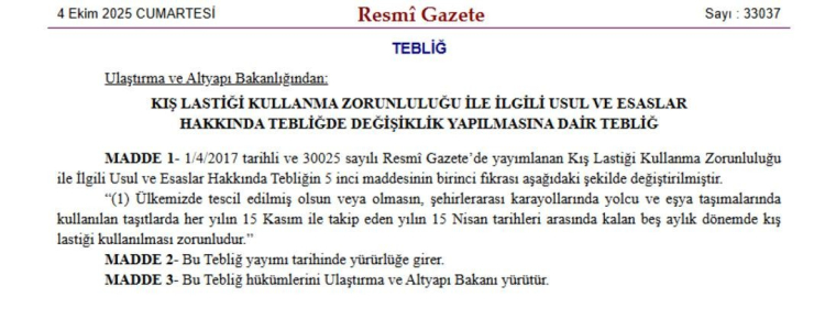 Resmi Gazete'de yayımlanan karara göre zorunlu kış lastiği uygulamasında tarihler değişti. Havaların soğuması ve yağışların başlaması ile beraber Ulaştırma ve Altyapı Bakanlığı tarafından hazırlanan tebliğ güncellendi. Buna göre, 1 Aralık-1 Nisan olan tarihler, 15 Kasım-15 Nisan olarak belirlendi.
