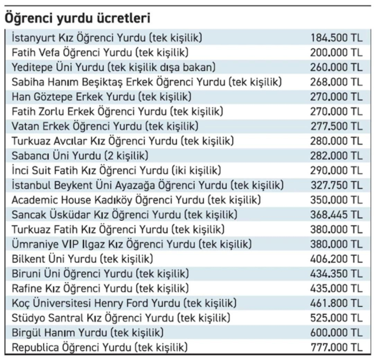 Prestijli vakıf üniversitelerinin üniversitelerinin yurt ücretleriyle birlikte, özel seçenekler arasında yer alan Birgül Hanım Yurdu ve Republica gibi popüler özel öğrenci yurtlarının fiyatları şaşırtıcı boyutlara ulaşmış durumda. Öğrenciler için “güvenli ve konforlu barınma” ihtiyacı giderek daha yüksek bir maliyet anlamına gelirken, aileler için de yeni dönem bütçe planlamasında en ağır kalemlerden biri yine konaklama olacak gibi görünüyor.