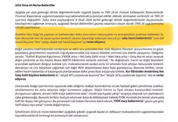 Revize edilen hacim beklentisi ve başlangıçta planlanandan daha yavaş fiyat artışlarıyla birlikte, Kur Etkisinden Arındırılmış Net Satış Geliri büyüme beklentimizi de 'düşük 40'lı yüzdelerde büyümeden düşük 30'lu yüzdelerde büyüme' olarak revize ediyoruz."