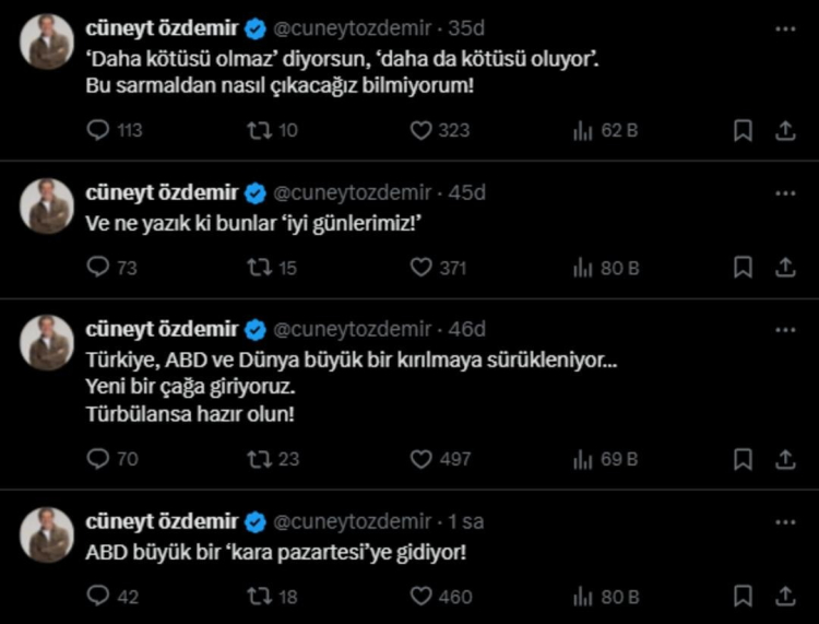 Trump'ın kararları piyasalarda 'kara pazartesi' oluştururken Gazeteci Cüneyt Özdemir, dünya borsalarında yaşanan dev kayıpların ardından sosyal medya hesabı üzerinden peş peşe açıklamalarda bulundu.