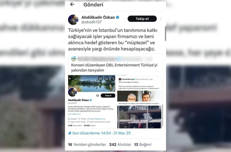 Mesajı tepki toplayan Özkan, kendisine ve şirketi DBL Entertainment'a yönelik paylaşımlara "Türkiye'nin ve İstanbul'un tanıtımına katkı sağlayacak işler yapan firmamızı ve beni aklınca hedef gösteren bu 'müptezel' ve avanesiyle yargı önünde hesaplaşacağız." diye yanıt verdi.