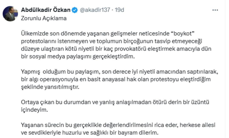 "Ülkemizde son dönemde yaşanan gelişmeler neticesinde “boykot” protestolarını istenmeyen ve toplumun birçoğunun tasvip etmeyeceği düzeye ulaştıran kötü niyetli bir kaç provokatörü eleştirmek amacıyla dün bir sosyal medya paylaşımı gerçekleştirdim.
