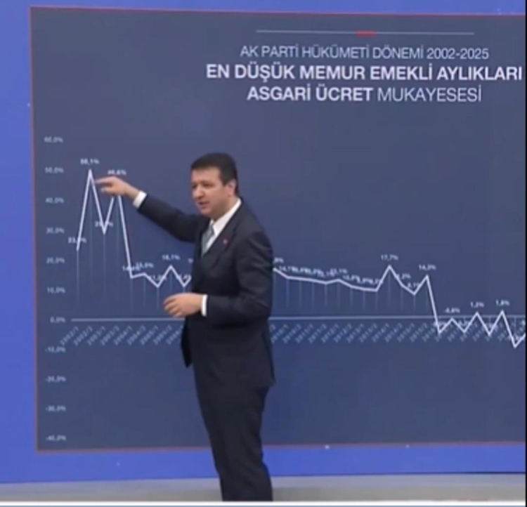 "AK Parti 2002'de iktidara geldiğinde, emekli tam yüzde 50,1 asgari ücrete göre daha fazla maaş alıyormuş. Ne zaman, '3Y ile mücadele edeceğiz' dedikleri dönemde; Türkiye'de yoksulluğu bitirdik dedikleri dönemde böyle bir maaş alıyorlarmış. Hatırlarsanız o dönemde ANASOL-M hükümeti vardı, MHP'de o zaman ortaktı. 'Biz bir enkaz devraldık' diyorlardı. Emekli maaşı yüzde 50 asgari ücretten fazla. Şu anda ise emekli maaşı asgari ücretin yüzde 25 altına gelmiş. Artı 50'den eksi 25'e gerilemiş. Enkaz aldıkları bir dönemdeki gibi bir ekonomi ortaya koymuş olsalardı bugün en düşük emekli maaşı 33 bin lira olacaktı. Ama bugün 16 bin lirayı büyük bir lütuf gibi emeklilere vermek zorundayız"