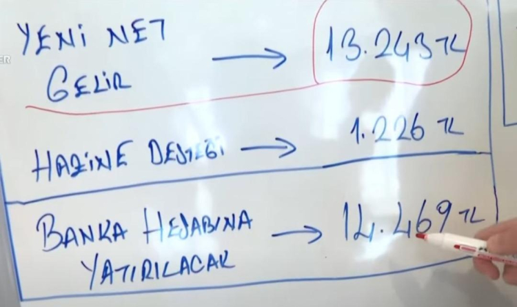 Hesaplamaları anlatan Çetinkaya "Diyelim sizin 2024 yılında 11 bin liralık bir kök maaşınız vardı. Ancak hesabınıza geçen 12 bin 500 liraydı. Yani bin 500 liralık Hazine desteği vardı. Bunun hesaplamasını nasıl yapacaksınız? 11 bin liraya yüzde 15.75 ekleyeceksiniz; 1733 lira yapıyor. Yani sizin enflasyon farkı ile beraber kök maaşınız 12 bin 733 lira oldu ancak bu rakamın üzerine bir de yüzde 4'lük ek ödeme ilave edeceksiniz, bu da 510 lira yapıyor. Yani sizin aslında totalde net geliriniz yani kök maaşınız 11 bin liradan 13 bin 243 liraya yükseldi. Ancak bu rakam en düşük emekli maaşının altında kaldığı için 1226 liralık da Hazine desteği ilave olacak. Sizin banka hesabınıza 14 bin 469 lira geçmiş olacak" şeklinde konuştu.