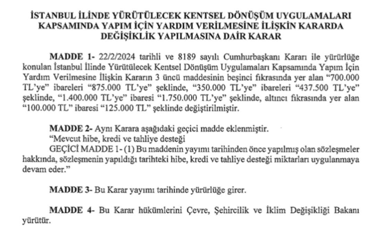 "Daha önce 700 bin lira olan hibemizi 875 bin liraya çıkarıyoruz. İstanbul'daki bir evin dönüşümü için verilen toplam destek miktarımızı 1 milyon 500 bin liradan 1 milyon 875 bin liraya getiriyoruz. iş yerleri için hibe desteğini 437 bin 500 liraya, kredi desteğini de 437 bin 500 liraya yükseltiyoruz. Taşınma yardımı da 125 bin liraya çıkıyor. İstanbul'un yarınları için hayırlı uğurlu olsun"