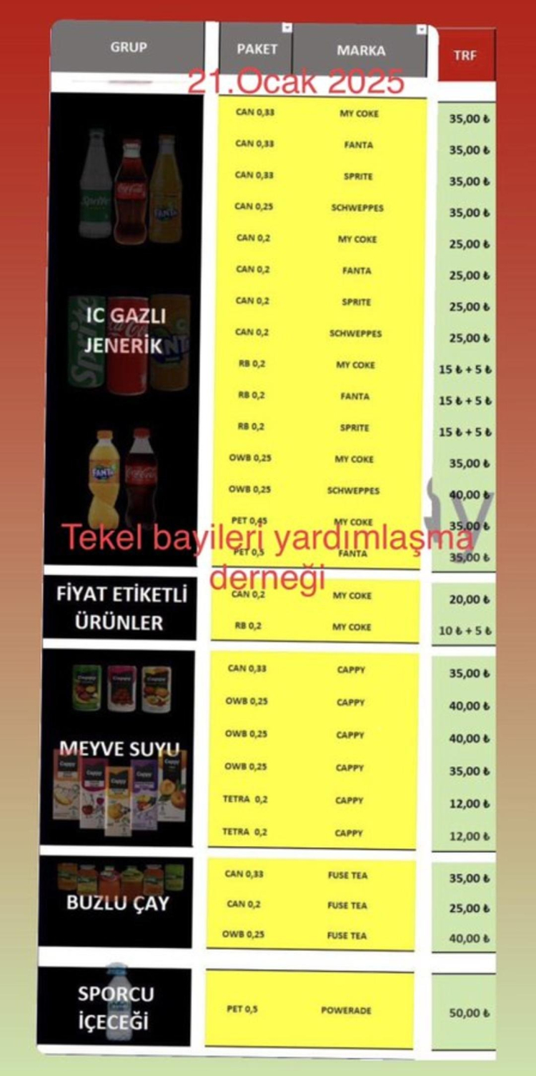 Tekel Bayileri Yardımlaşma Derneği (TBYD) Başkanı Erol Dündar, sosyal medya hesabı üzerinden gazlı içecekler ve meyve sularına zam geldiğini duyurdu.