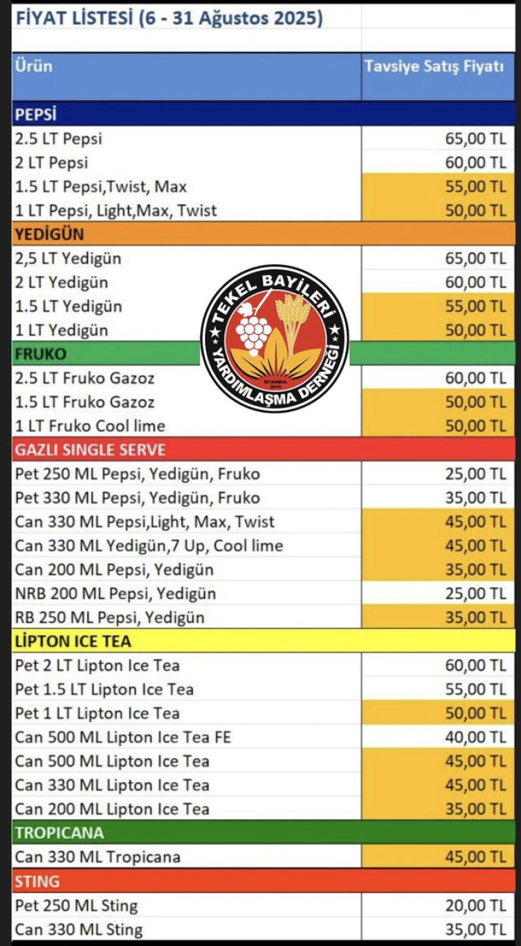 Tekel Bayileri Yardımlaşma Derneği (TBYD) Başkanı Erol Dündar'ın paylaştığı bilgiye göre, zamlı fiyatlar 6 Ağustos 2025 Salı günü itibarıyla geçerli oldu. Yeni fiyat listesine göre 1,5 litrelik Pepsi ise 55 TL'den raflardaki yerini alacak.