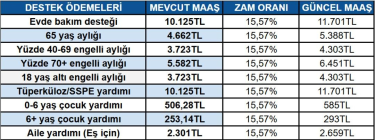 Bu zamla birlikte, yaşlılık maaşından engelli ve evde bakım aylığına kadar pek çok sosyal yardım kalemi de güncellendi.