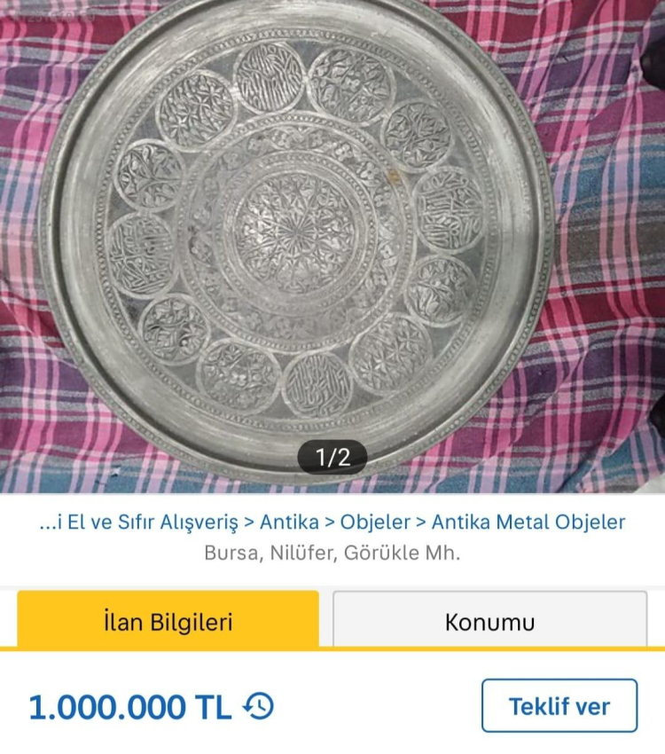 Bakır veya pirinçten yapılmış yuvarlak tepsi benzeri eşyalar çevrimiçi satış platformalarında alıcılarını bekliyor.