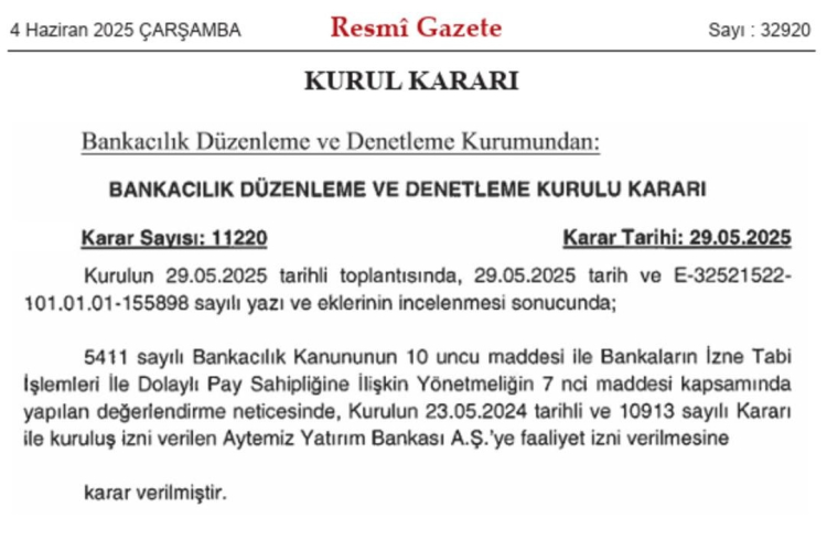 Resmi Gazete'de yayımlandı iki yeni banka geliyor. Bankacılık Düzenleme ve Denetleme Kurulu (BDDK), Aytemiz Yatırım Bankası A.Ş.’ye faaliyet izni verilmesine karar verdi.