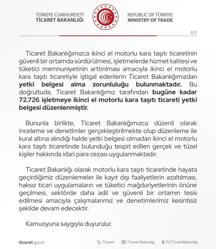 Bakanlık açıklamasında, ikinci el araç satışlarında şeffaflığın ve tüketici güvenliğinin artırılması için denetimlerin süreceği belirtildi. Ayrıca araç alım-satım işlemlerinde yetki belgesi şartına uymayanlara yönelik cezaların devam edeceği vurgulandı.