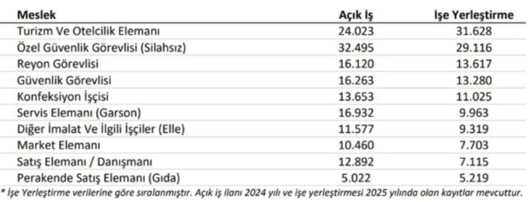 Ocak-Nisan dönemi incelendiğinde ise 2025 döneminde sektörler itibarıyla en fazla iş yerleştirme sanayi sektöründe 'imalat' alanında oldu. Mesleklere göre ise en fazla işe yerleştirme sırasıyla "Turizm ve Otelcilik Elemanı", Özel Güvenlik Görevlisi (Silahsız) ve reyon görevlisi” mesleklerinde yapıldı.