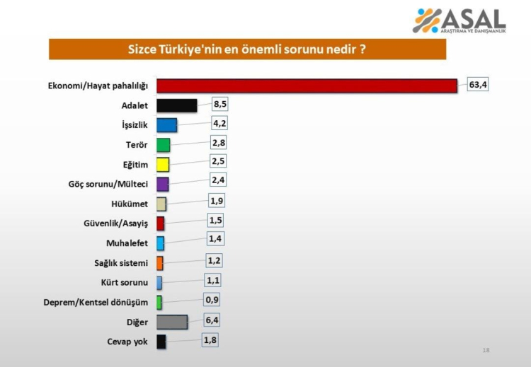 Yapılan ankette açık ara fark ile Ekonomi/Hayat pahalılığı listenin başına yerleşti. Yüzde 63,4 oranı ile vatandaşın en büyük problemi hayat pahalılığı oldu.