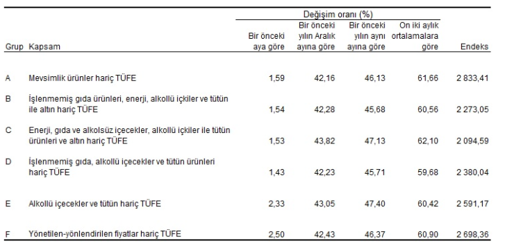 İşlenmemiş gıda ürünleri, enerji, alkollü içkiler ve tütün ile altın hariç TÜFE'deki değişim, 2024 yılı Kasım ayında bir önceki aya göre yüzde 1,54, bir önceki yılın Aralık ayına göre yüzde 42,28, bir önceki yılın aynı ayına göre yüzde 45,68 ve on iki aylık ortalamalara göre yüzde 60,56 olarak gerçekleşti.