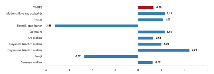 Ana sanayi gruplarının aylık değişimleri; ara mallarında yüzde 0,64 artış, dayanıklı tüketim mallarında yüzde 1,0 artış, dayanıksız tüketim mallarında yüzde 2,21 artış, enerjide yüzde 2,32 azalış ve sermaye mallarında yüzde 0,62 artış olarak gerçekleşti.