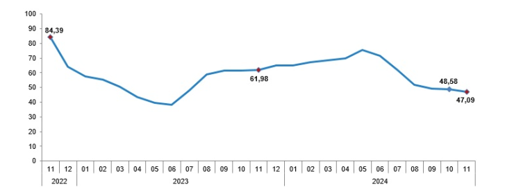 TÜFE'deki (2003=100) değişim 2024 yılı Kasım ayında bir önceki aya göre yüzde 2,24, bir önceki yılın Aralık ayına göre yüzde 42,91, bir önceki yılın aynı ayına göre yüzde 47,09 ve on iki aylık ortalamalara göre yüzde 60,45 olarak gerçekleşti.