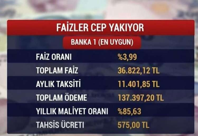 Toplam maliyeti 137 bin lirayı aşan kredinin yıllık maliyet oranı yüzde 85 oluyor.