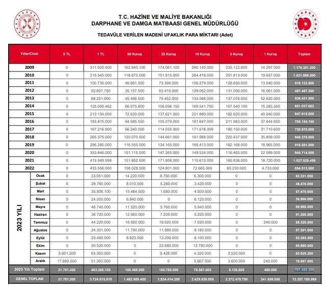 2022 yılında 854 milyon 13 bin 500 adet madeni para tedavüle girerken, 2023 yılında bu rakam 781 milyon 492 bin 300’e geriledi.