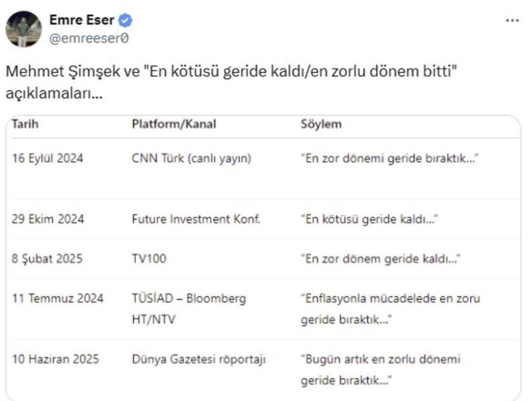 Şimşek’in “En zorlu dönemi geride bıraktık” cümlesi sosyal medyada kısa sürede geniş yankı uyandırdı. Çünkü bu ifade, Bakan tarafından ilk kez söylenmiyordu.