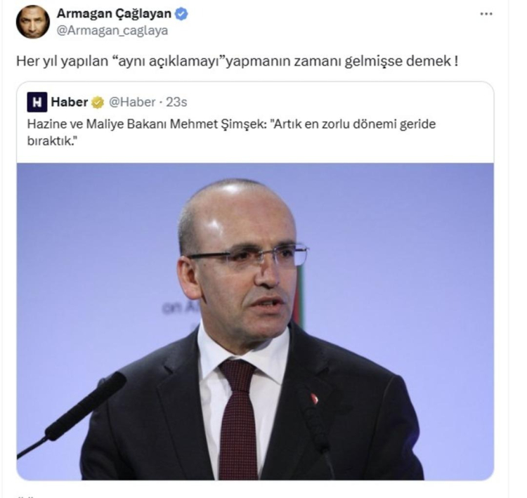 Şimşek’in sözleri hakkında sosyal medyada yorumlar yapılırken, Armağan Çağlayan da paylaşımında, “Her yıl yapılan ‘aynı açıklamayı’ yapmanın zamanı gelmişse demek!” ifadelerine yer verdi.