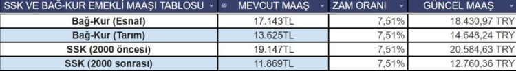 SSK VE BAĞ-KUR EMEKLİSİ MAAŞ TABLOSU