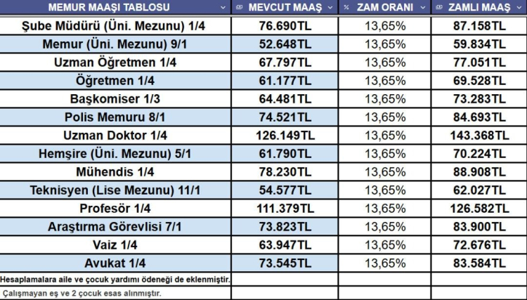 3 AYLIK ENFLASYON FARKINA GÖRE MEMUR MAAŞ TABLOSU