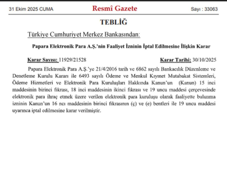 Merkez Bankası, Papara hakkındaki kararını verdi. Resmi Gazete'de yayımlanarak yürürlüğe giren karara göre Merkez Bankası, Papara AŞ'nin faaliyet izinlerinin tümünü iptal etti.