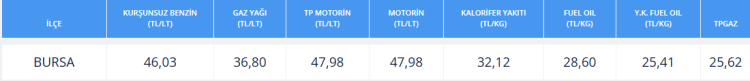 BURSA'DAKİ GÜNCEL FİYATLAR